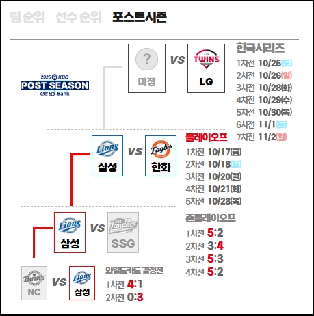 준플레이오프의 혈투를 뚫고 올라온 삼성 라이온즈! 이제 다음 상대는 정규시즌 2위를 차지한 한화 이글스입니다. 이 두 팀 중 승리하는 팀만이 대망의 한국시리즈에서 우리 엘지 트윈스와 격돌하게 되는 거죠!